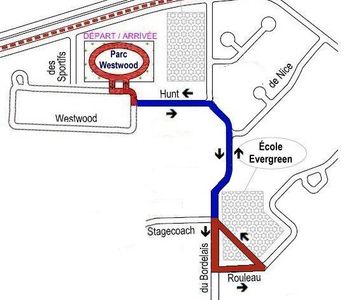 Le parcours du 2 km est une boucle avec comme points de départ et d'arrivée le parc Westwood et passant par l'école Evergreen.